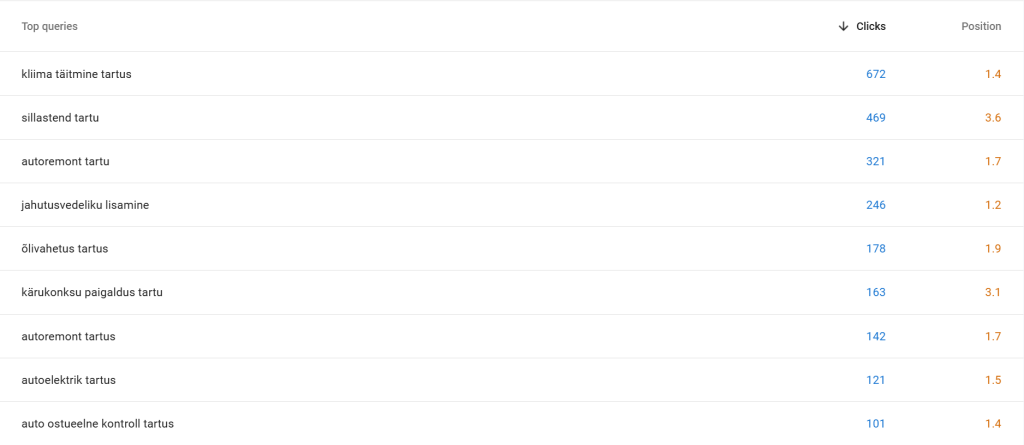 Projekti alguses kaardistasime peamised teenused ja märksõnad, mille kaudu kliendid autoteenindust otsivad, näiteks õlivahetus, sillastend, autodiagnostika ja autoremont.